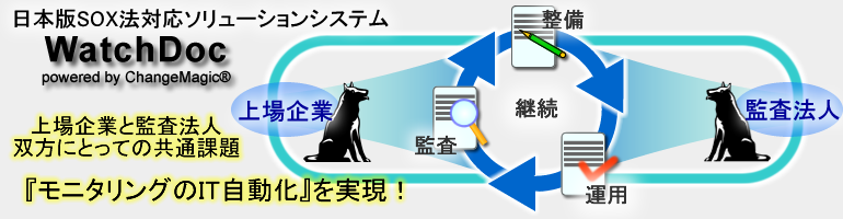 「WatchDoc」は、関係会社である米国法人ケープレックス・インクが有する独自の高度先進テクノロジーソフトウエア製品「ChangeMagic®」(※)との製品連携によって、整備フェーズから運用フェーズ・監査フェーズ、さらには継続運用・継続監査まで、『日本版SOX法(金融商品取引法の内部統制)に係る業務の有効性・効率性』の向上をサポートします。